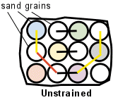 Material lines are imaginary lines that extend through material points(van der Pluijm and Marshak, 1997). For example, consider an irregular 2D volumetric element of sandstone. Now connect the centers of some grains by material lines as illustrated in the following sketch.